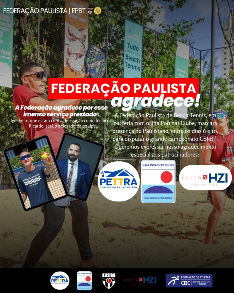 Entre os dias 6 e 10, a Federação Paulista de Beach Tennis, em parceria com o Ilha Porchat Clube, estará presente no Paulistano para disputar o prestigiado Campeonato CBI-BT, um dos maiores eventos do calendário nacional da modalidade. ✨ Agradecemos de forma especial aos patrocinadores que tornam essa participação possível:🥇 Petra🥇 Grupo HZIPelo apoio fundamental […]